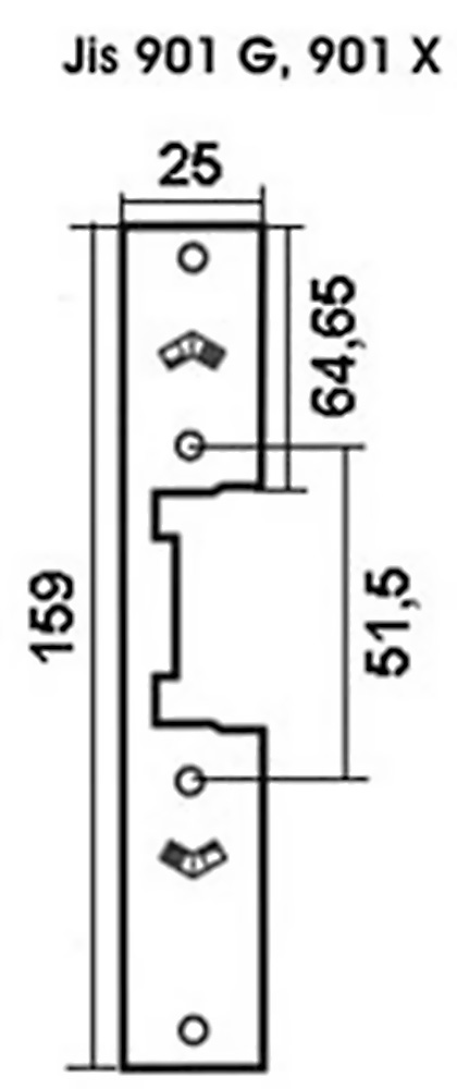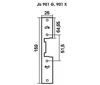 FRONT Pentru seria 54Finisaj:- G=gri - X= inox INSTRUCTIUNI DE UTILIZARE CONTRAPLACA ZAVOR ELECTRIC JIS SPANIA ModelulLlDescriere901G/X15925Platbanda scurta gri inoxMod.901G/X este compatibil cu seria de zavoare 54. Este o platbanda scurta, plata, din otel inox cu suprafata exterioara lustruita si finisata,(901X) sau vopsita in culoarea gri (901G). Are gauri de prindere a zavorului si pentru fixarea pe usa.