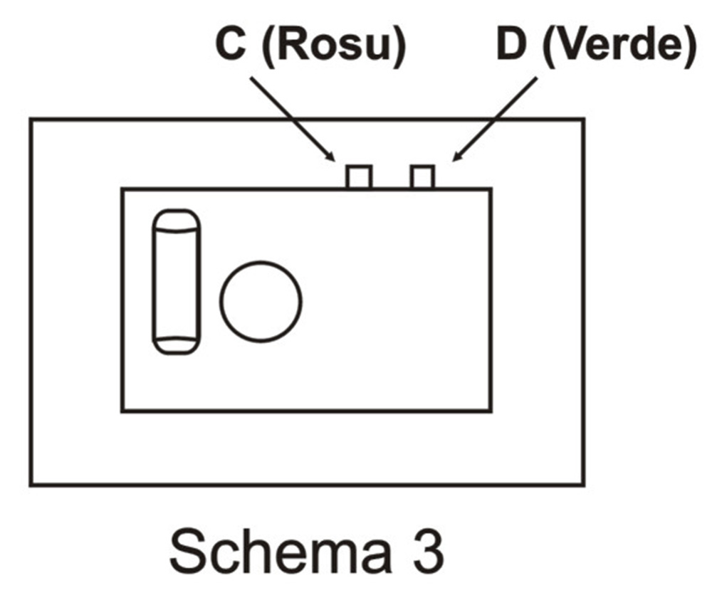 3. PROGRAMAREA AMPRENTEI PENTRU IDENTIFICARE A. Cu usa seifului deschisa, apasati butonul verde ‘D’ de pe spatele usii partea de sus (vezi schema 3). Becul galben se va aprinde si cititorul de amprenta este pregatit. B. Puneti degetul pe geamul cititorului timp de 10 secunde. Cand veti auzi un sunet (beep) lung si becul verde se va aprinde, amprenta dumneavoastra a fost inregistrata cu succes. C. Daca inregistrarea amprentei nu are succes, veti auzi 3 sunete (beep-uri) si becul rosu se va aprinde de 3 ori. Repetati punctele A si B pentru a programa amprenta dumneavoastra din nou. D. Seiful poate inregistra 255 de amprente diferite.