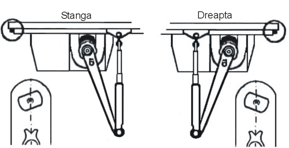 3. MONTAREA BRATULUI:Amortizoarele pentru usa sunt livrate cu un brat format din 2 parti: bratul mobil (3) care se fixeaza pe ax (7) si bratul fix (4) care se fixeaza pe tocul usii sau pe usa. Axul filetat (7) este frezat excentric, rezultand doua laturi paralele inegale, prinderea bratului (3) facandu-se astfel:- se identifica vizual forma axului privit de sus (aproximativ trapezoidala)- se identifica decuparea din capatul bratului- se fixeaza bratul in ax si se blocheaza prin insurubarea piuliteiNumai montarea in aceasta pozitie a bratului (fara a se incerca sub nici o forma pilirea lui) va permite ulterior realizarea performantelor amortizorului si un reglaj corect