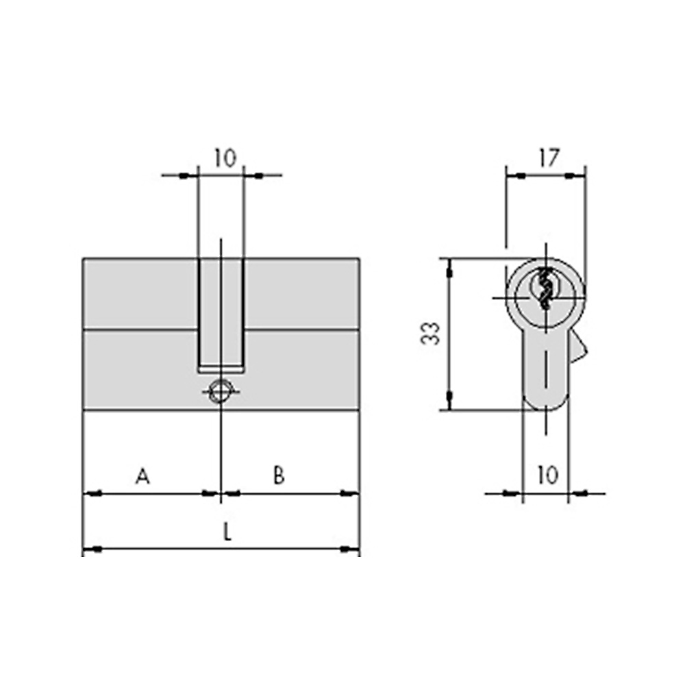 Caracteristici tehnice: - Cilindru dublu - sistem cheie cu 10 pini - corp de alama - rotitor alama - cama DIN din otel sinterizat, cu autoungere - pini: (in rotitor) - bronz rezistent la uzura - otel tratat pentru primul pin - driveri: (in partea fixa a corpului cilindrului) - din alama - otel tratat pentru primul pin - arcuri din bronz fosforicCHEI: - Chei plate, reversibile - din alama nichelata - numerotate pe capul cheii - 2,9 mm. grosime - 0,48 mm. adancimeDotare standard: - Suruburi de fixare - 3 chei cod 1.00620.01.0 - CARTELA COD CHEIELa cereret: - Cheie KA, MK, GMKFinisaje: - STANDARD: alama slefuita (fin. 00) - LA CERERE: alama nichelata (fin. 12),alama lacuita (fin. 66)Standarde: - Fabricata in comformitate cu:- EN 1303: grade 6 Durabilitate, grade 3Securitate- DIN 18254 (ref. DIN EN 1303)- SKG** (versiune speciala)
