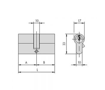 Caracteristici tehnice: - Cilindru dublu - sistem cheie cu 10 pini - corp de alama - rotitor alama - cama DIN din otel sinterizat, cu autoungere - pini: (in rotitor) - bronz rezistent la uzura - otel tratat pentru primul pin - driveri: (in partea fixa a corpului cilindrului) - din alama - otel tratat pentru primul pin - arcuri din bronz fosforicCHEI: - Chei plate, reversibile - din alama nichelata - numerotate pe capul cheii - 2,9 mm. grosime - 0,48 mm. adancimeDotare standard: - Suruburi de fixare - 3 chei cod 1.00620.01.0 - CARTELA COD CHEIELa cereret: - Cheie KA, MK, GMKFinisaje: - STANDARD: alama slefuita (fin. 00) - LA CERERE: alama nichelata (fin. 12),alama lacuita (fin. 66)Standarde: - Fabricata in comformitate cu:- EN 1303: grade 6 Durabilitate, grade 3Securitate- DIN 18254 (ref. DIN EN 1303)- SKG** (versiune speciala)
