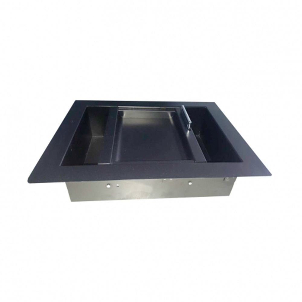 Concepute in special pentru casele de schimb valutar, casele de amanet si institutiile finaciar-bancare, sertarele sunt disponibile in varianta cu una cuva culisanta ( simple sau rama inox )Actionarea sertarului se face indirect - prin miscarea capacului - care ocupa alternativ pozitia opusa. Capacul se blocheaza la capetele cursei prin intermediul unui mecanism automat.Inaltimea intregului sertar este de 120 mm. Rama si capacul protector sunt confectionate din otel inox. In varianta standard capacul este blindat in interior cu o placa de otel de 5 mm. Optional se poate livra si o carcasa protectoare confectionata tot din otel.Sertarele sunt vopsite in camp electrostatic culoare neagra. Clasa de rezistenta la actiunea armelor de foc corespunde clasei FB2 S, cf. SR EN 1522: 2004.