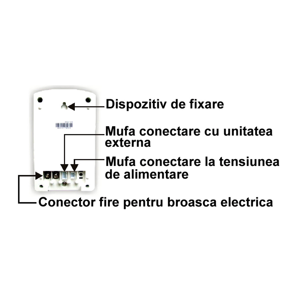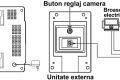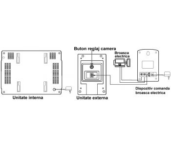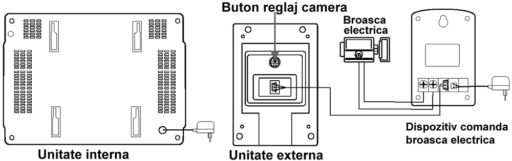 A. Unitatea externa: - Conectati Dispozitivul comanda broasca electrica cu unitatea externa - Conectati Dispozitivul de comanda broasca electrica cu 2 fire la broasca electrica - Conectati iesirea transformatorului la Dispozitivul de comanda broasca electrica asa cum se vede in pictograma - Conectati transformatorul adaptor de 12V / 1000mA la priza de 220Vca B. Unitatea interna: Introduceti transformatorul adaptor de 12V / 1000mA in priza de 220Vca si apoi conectati-l la mufa din spate a unitatii interne(monitorului).Urmariti cu atentie pictograma de conexiuni pentru o intelegere corecta a aplicatiilor de mai sus. Instructiuni de utilizare: