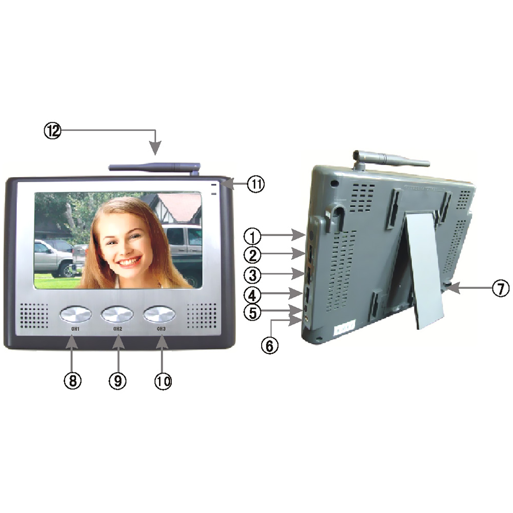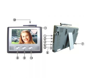 1. Buton comanda canal „Auto-transfer”2. Stralucire3. Culoare4. Volum5. Buton deschidere broasca electrica6. Monitor7. Conector sursa electrica8. Canal 19. Canal 210.Canal 311. Led indicator sursa alimentare12. Antena Instalare:A. Unitatea interna