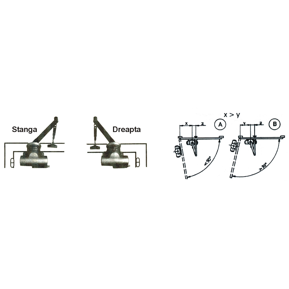 Aspect clasic.Se folosesc pentru usa de stanga si dreapta.Montaj usor.Cu reglaj de forta si viteza a ciclului de inchidere.Amplitudine a unghiului de deschidere a usii ajustabila.Produs in trei marimi de forta:marime 12 20-38kg greutate usa 80cm latime usa(max)marime 13 30-60kg greutate usa 90cm latime usa(max)marime 14 42-70kg greutate usa 105cm latime usa(max)