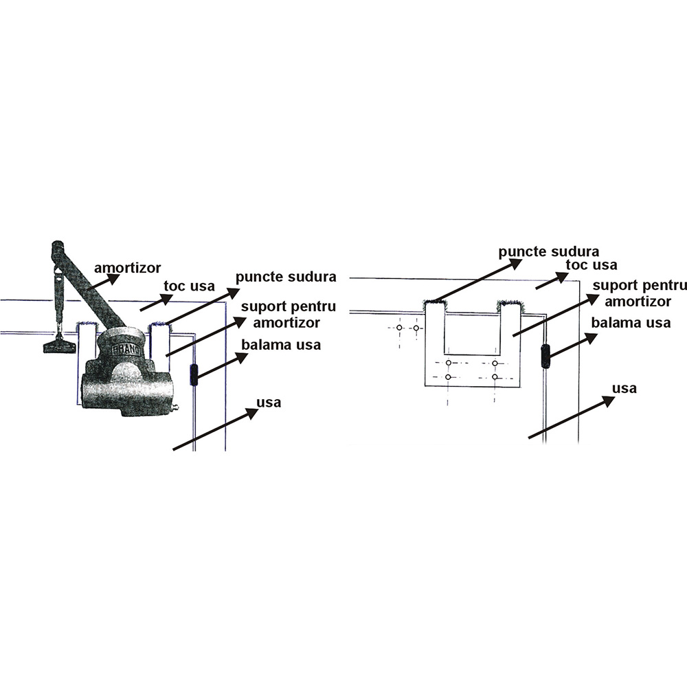 3. MARCAREA ORIFICIILOR DE PRINDEREMarcarea se face numai cu ajutorul sablonului de montaj. Inainte de a marca gaurile de prindere, decideti daca usa se va deschide intr-un unghi de 90 grade (A) sau peste 90 grade (B) - vezi sablonul. In functie de acest lucru aplicati sablonul pe usa si marcati locurile pentru gaurire, pentru a prinde amortizorul si bratul. 4. GAURIREA- Pentru usi si tocuri din lemn se foloseste burghiu Ø=3,5 mm cu adancimea de gaurire de 14 mm in usa si 25 mm in toc. Daca usa este goala inauntru dati gaurile prin usa. Apoi atasati amortizorul cu suruburi M5 de lungime potrivita, iar pe partea cealalta a usii se pune piulita. - Pentru usi de metal se gaureste cu burghiu Ø=4,2 mm. Daca nu este suficient spatiu pentru fixarea amortizorului pe usa se va suda un suport metalic in forma de “U” de tocul superior al usii. Peste acest suport se va prinde cu 4 suruburi corpul amortizorului, bratul fixandu-se cu 2 suruburi de marginea superioara a usii, asa cum se vede in figura urmatoare: Vedere din interior pentru usa pe dreapta, cu deschidere Vedere din interior pentru usa pe dreapta, cu deschidere spre exterior - cazul cu amortizor montat pe suport spre exterior - cazul fara amortizor montat pe suport
