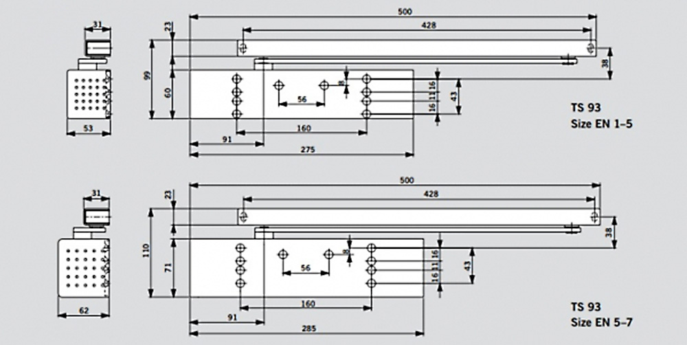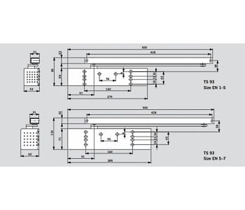 Usa standard, De exterior, Cu deschidere in exterior, Pt.usi rezistente la foc pana la1250 mm (EN 2-5)/1600mm (EN5- 7)ReversibilTip ansamblu brat - cu sinaForta de inchidere reglabila din suruburile de reglajViteza de inchidere reglabila din valvele de reglajViteza finala de zavorare ajustabila- din valvaBackcheck (franarea deschiderii)- reglaj din valvaDelayed action (intarziere inchidere) reglabila din valvaHold-open - optional