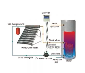 ALEGEREA TIPULUI DE SISTEM SOLAR :1- 2 persoane = 10 tuburi cu 1 rezervor de stocare de 100 litri.TIMPUL DE INCALZIRE al apei din boiler in numarul de ore, intr-o zi cu soare, in functie de volum, la 45ºC:2 h = 100 l 3h 30’ = 150 l 5 h = 200 l 7h 30’ = 300 l.Tuburile vidate concentrice din sticlă sunt realizate după principiul termosului, acestea având o structură tub-în-tub.PRINCIPIUL DE LUCRU al sistemului solar: absorberul (tuburile vidate) capteaza energia solara si o transfera catre agentul termic primar pe care îl strabate, iar acesta la rândul sau, schimba caldura cu agentul termic secundar, adica apa rece din boiler, producandu-se astfel apa calda menajera.La o diferenta de temperatura de 8°C intre temperatura indicata de senzorul din panou si temperatura indicata de senzorul din boiler, este pusa in functiune pompa de recirculare.