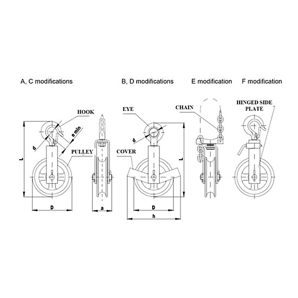 DIMENSIUNI PRINCIPALEGREUTATE(KG.) abcdd0DeLL0 A3561-30±2-12520240-1,7B3561--28125--2331,8C35611653-12520240-1,9D3561165-28125--2332,01. DOMENIUL DE UTILIZAREScripetele se foloseşte numai pentru ridicarea manuala a încărcăturilor folosind frânghii textile până la diametrul de 25 mm.Scripeţii sunt produşi în 4 tipuri.Tip A - scripetele cu cârlig fără apărătoareTip B - scripetele cu ochi fără apărătoareTip C - scripetele cu cârlig şi apărătoareTip D - scripetele cu ochi şi apărătoare. 2. MONTAJ (ASAMBLARE)Utilizatorul este obligat să se asigure că este agăţat pe un element de susţinere dimensionat corect pentru a evita desprinderea în timpul ridicării - coborârii încărcăturii de capacitate maxima nominală. 3. MOD DE FOLOSIRERidicarea se produce prin tragerea frânghiei, alternând o mână cu alta, ţinând cont că scripetele nu are frână care să poată susţine încărcătura în orice poziţie.Este necesar că utilizatorul să urmărească mişcarea încărcăturii ca să poată preveni căderea accidentală când ridicarea este întreruptă. 4. TESTAREÎnainte de a-l pune în funcţiune, după demontare sau reparaţii este necesar să verificaţi dacă scripetele împreună cu utilajul conectat funcţionează uşor şi în siguranţă.Scopul testului:Scripetele este încărcat cu o sarcină care depăşeşte cu 10 % din greutatea nominală şi este ridicat şi coborât cel puţin un ciclu. Derularea operaţiei trebuie să fie lină, în siguranţă şi frânghia să nu prezinte rosături. 5. ÎNTREŢINEREPentru a asigura operarea scripetelui în perfectă siguranţă şi în condiţii tehnice bune, utilizatorul este obligat să facă următoarele:a) La intervale de timp regulate, sau la 200 de ore lucrate se va controla instalaţia verificând starea părţilor componente şi a frânghiei, dacă nu prezintă urme de deformări, crăpături, sau uzură intensă.b) Frânghia de cânepă trebuie menţinută uscată. Pentru o mai mare durată de viaţă a frânghiei se va face o ungere cu un amestec de ulei şi ulei de în în proporţie de 1:3 sau cu un lubrifiant special pentru frânghiile folosite la scripeţi. 6. MANEVRE PERICULOASE INTERZISEa) să folosiţi cablu de oţelb) să staţi sub încărcătură sau aproape de ea, fiind în primejdie în caz de cădere a încărcăturiic) să suspendaţi scripetele de un element a cărui rezistemţă de susţinere este necunoscută (de exemplu: ţevi, grindă, etc.) sau alte structuri instabiled) să ridicaţi încărcături dacă frânghia prezintă uzură sau rosături.e) 7. PERIOADA DE GARANŢIEProducătorul garantează calitatea, funcţionarea şi manevrabilitatea scripetelui cu rolă pe o perioada de 12 luni din ziua punerii în funcţiune dar maxim 24 de luni după ieşirea din depozitul fabricii producătorului.